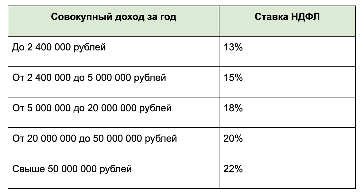 Если годовой доход превышает 2 400 000 рублей, налог считается поэтапно. Сначала применяется ставка 13% к сумме 2 400 000 рублей, а затем повышенная ставка — к части дохода сверх этого лимита (п. 1.1 ст. 224 НК).